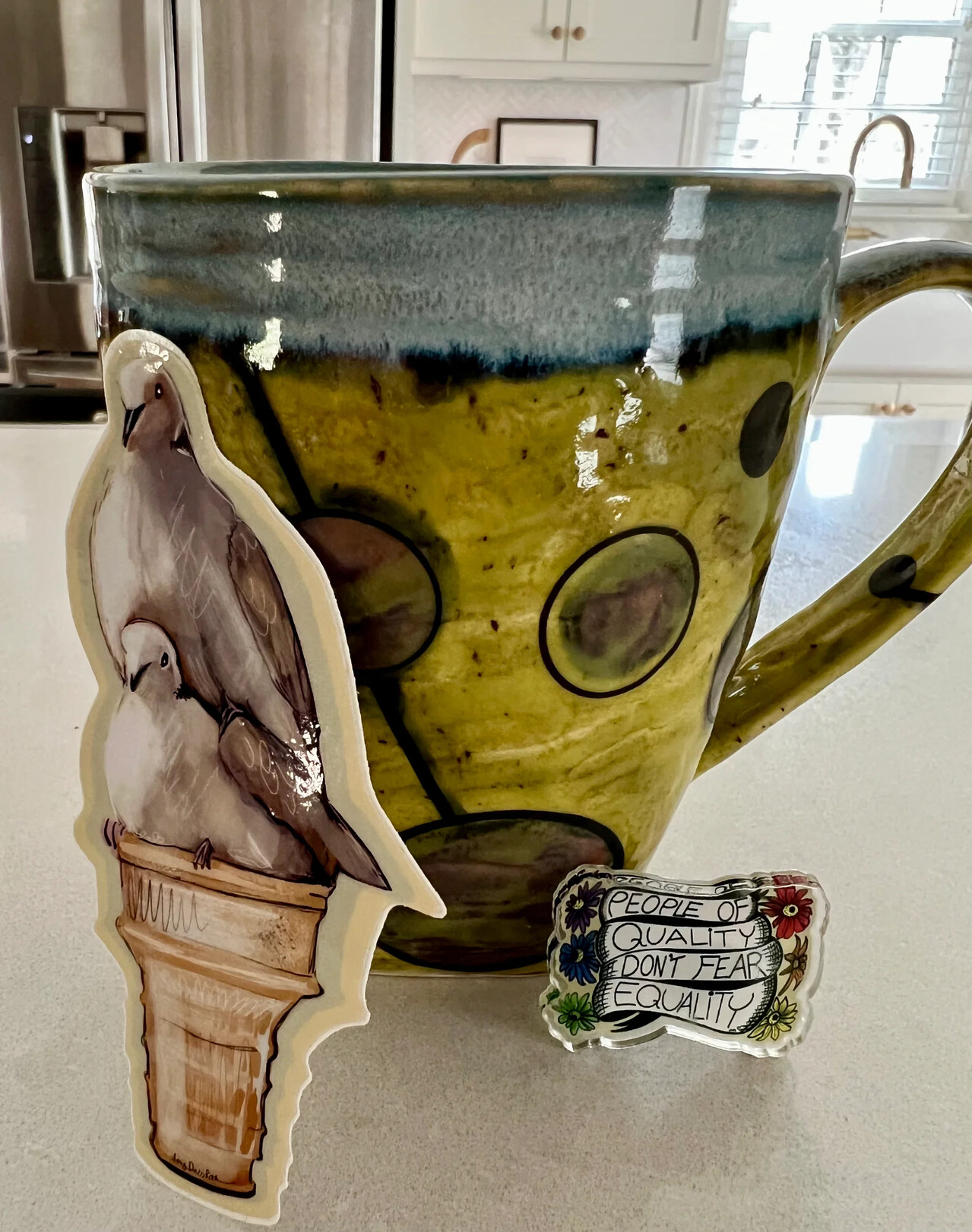 I love buying pottery from @SurlyAmy because it always comes with goodies! I didn't even know I wanted a sticker with pigeons in an ice cream cone until she gave me one ๐