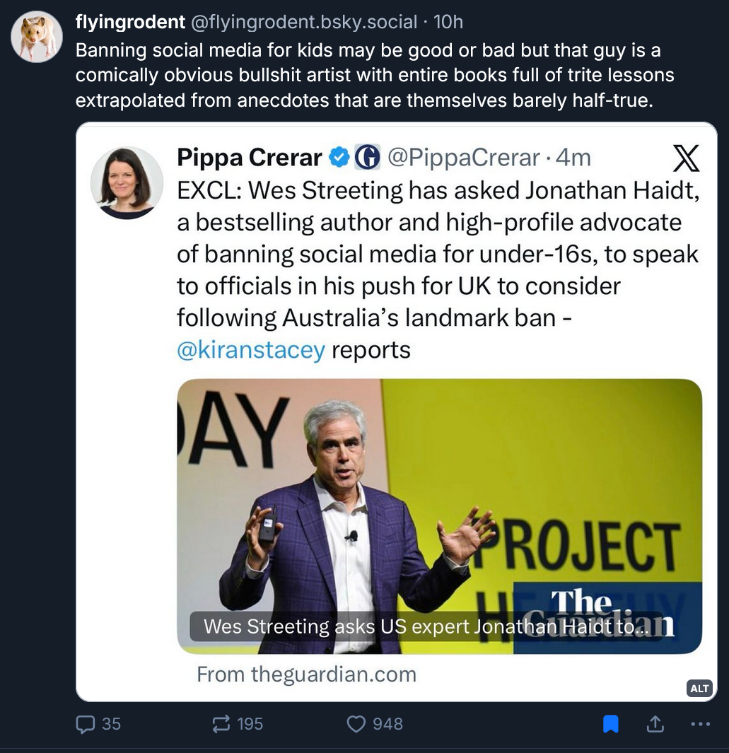 why might a colossal transphobe like streeting want to keep under 16s off social media. i wonder. what he thinks. they are "catching" on here