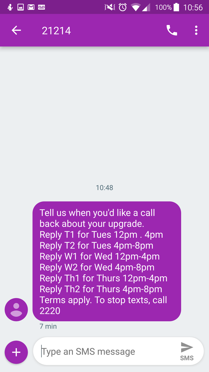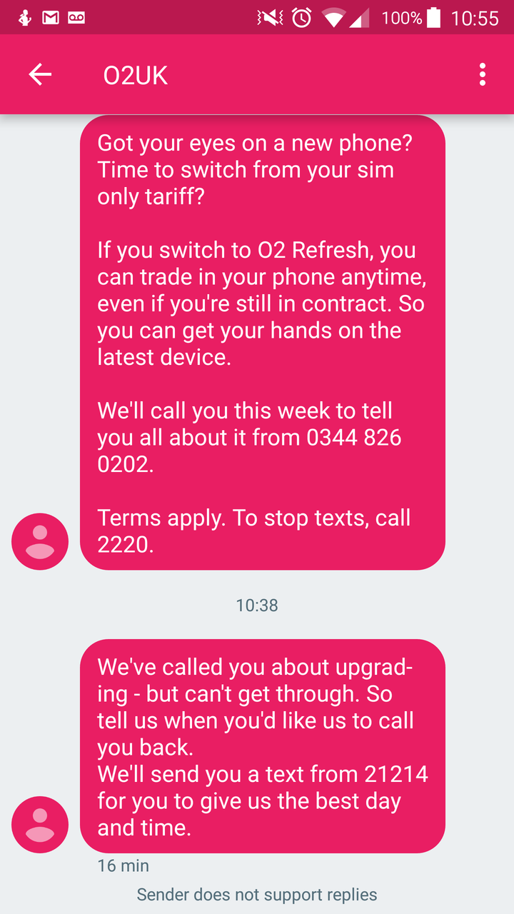 had 4 text messages from O2 this morning saying they're going to call me to talk about upgrading my phone even though I don't care, they're trying real hard to get me to trade in my phone for a new one though