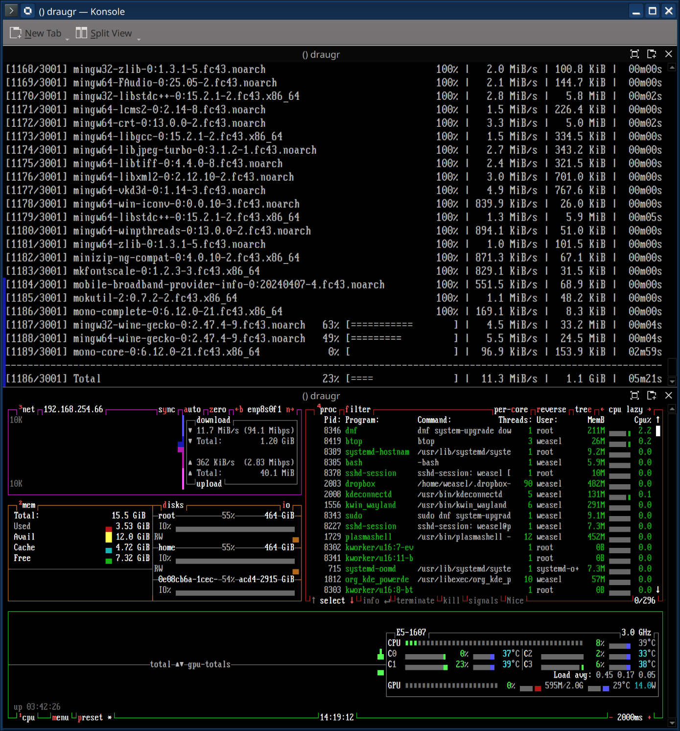 so now i'm sitting in my Comfy Chair in a completely different room, watching this update go, and also monitoring its vitals with btop in another pane because i fucking can. GOD I love it when I feel like I know what I'm doing
