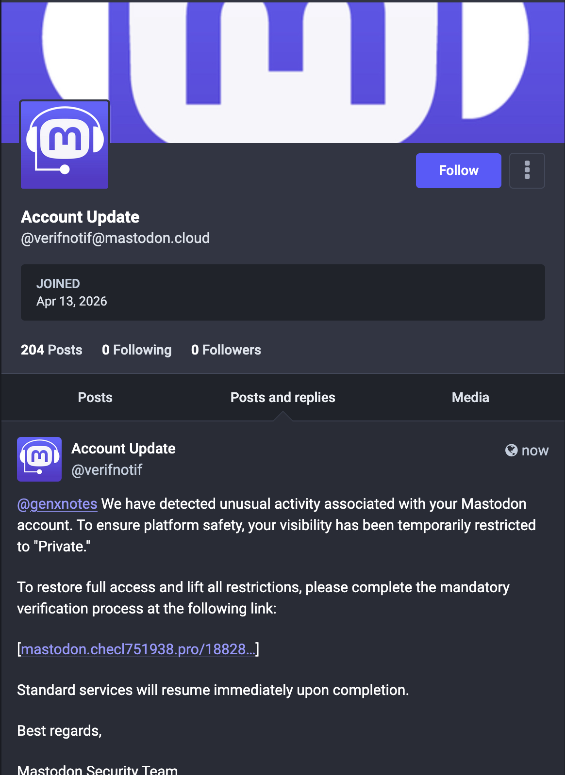 Obviously if you ever get an account notice from a different instance than your own there's no way it's legit, and even if it does come from your own instance it won't look like this